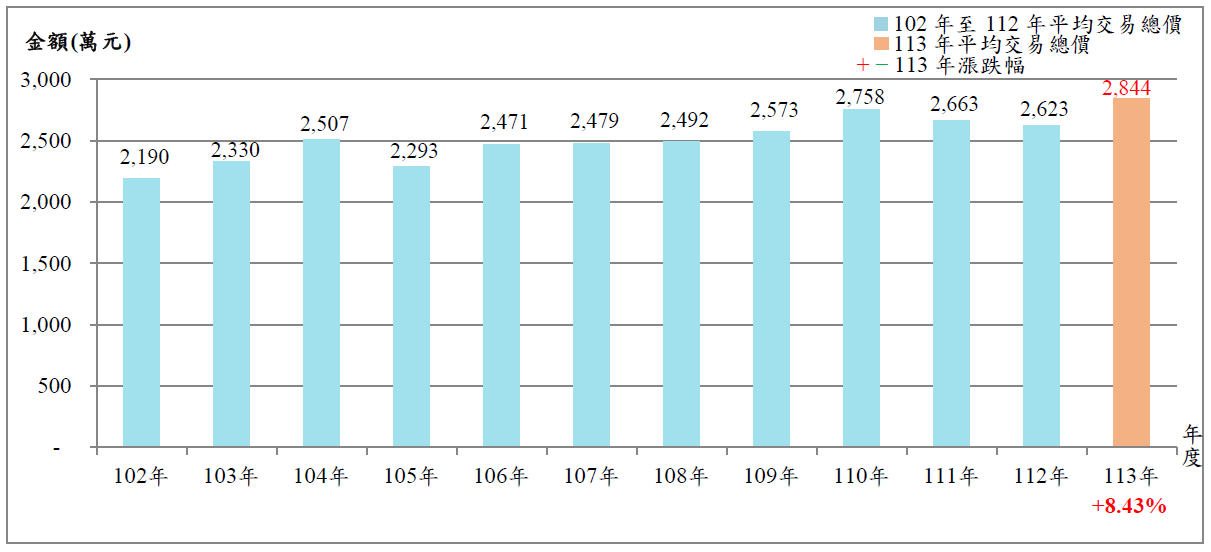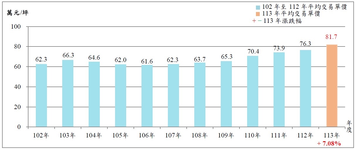 113年全市住宅平均交易總價為2,844萬元,較112年上漲8.43%(圖2);113年全市住宅平均單價為81.7萬元/坪,較112年上漲7.08% (圖3)。二者均創102年以來新高。