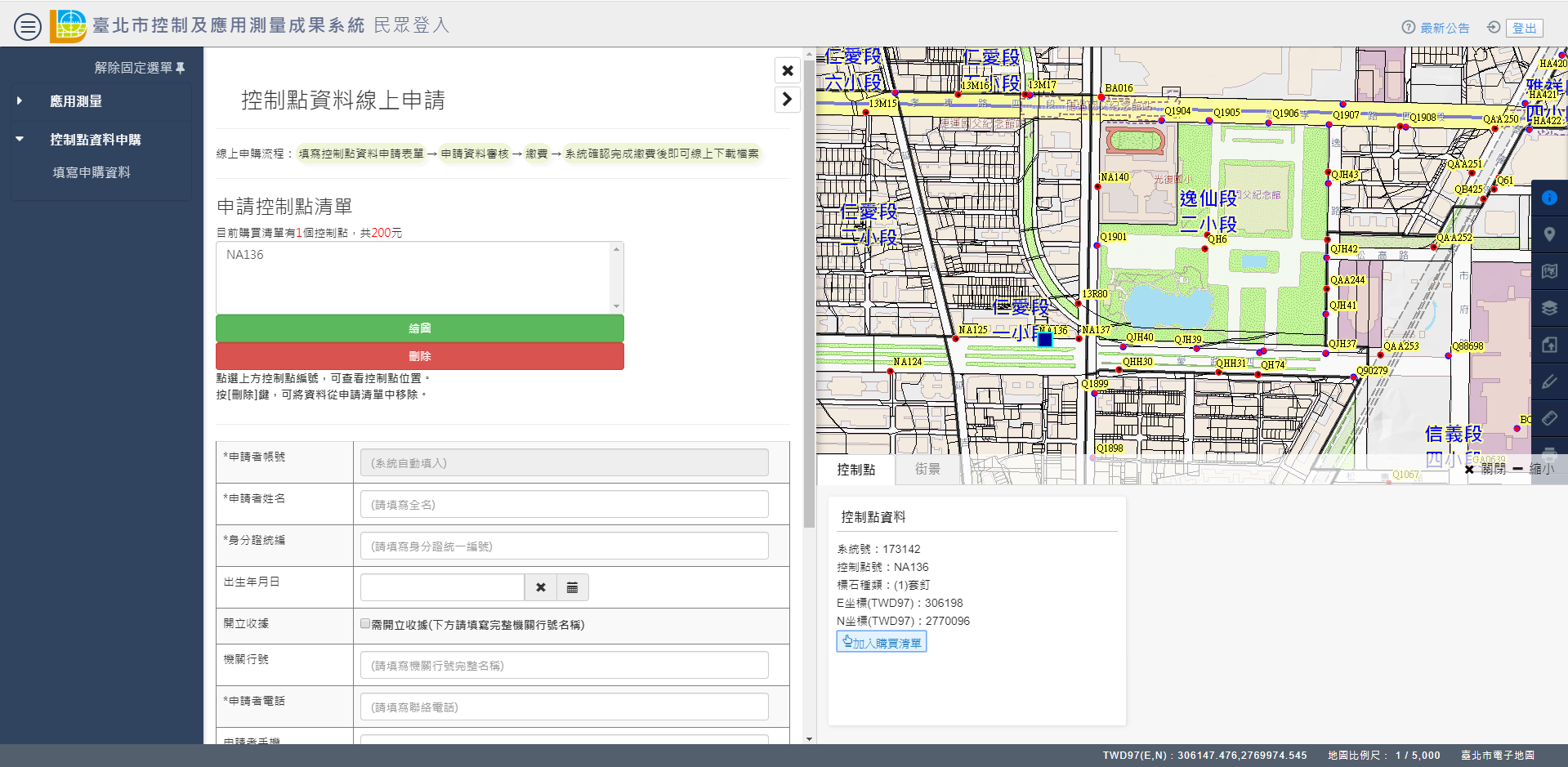 原控制測量成果管理系統控制點申購功能已移植於新系統內,民眾可於線上點選欲申購的控制點,並線上送出申請單,繳費後即可經由電子郵件收到控制點坐標資料,線上申購好方便(如圖2)。