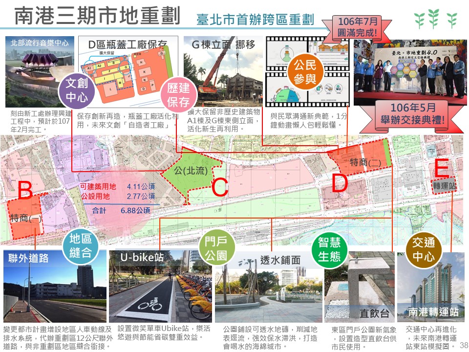 南港三期市地重劃案,作為東區門戶計畫的先鋒,不僅取得了車站及文創中心用地,還擴大保留瓶蓋工廠的歷史建物、縫合開發區內外的公共設施,讓道路、維生管線銜接順暢,更納入環保永續智慧生態的思維,在新闢公園中設置直飲台、節能減碳的LED燈、透水性鋪面人行步道、保水量17.3噸的滲透性側溝、綠色交通Youbike站等設施,做為臺北市智慧生態示範區,為南港居民打造更美好的家園,朝宜居城市的目標大步邁進(如圖4)。