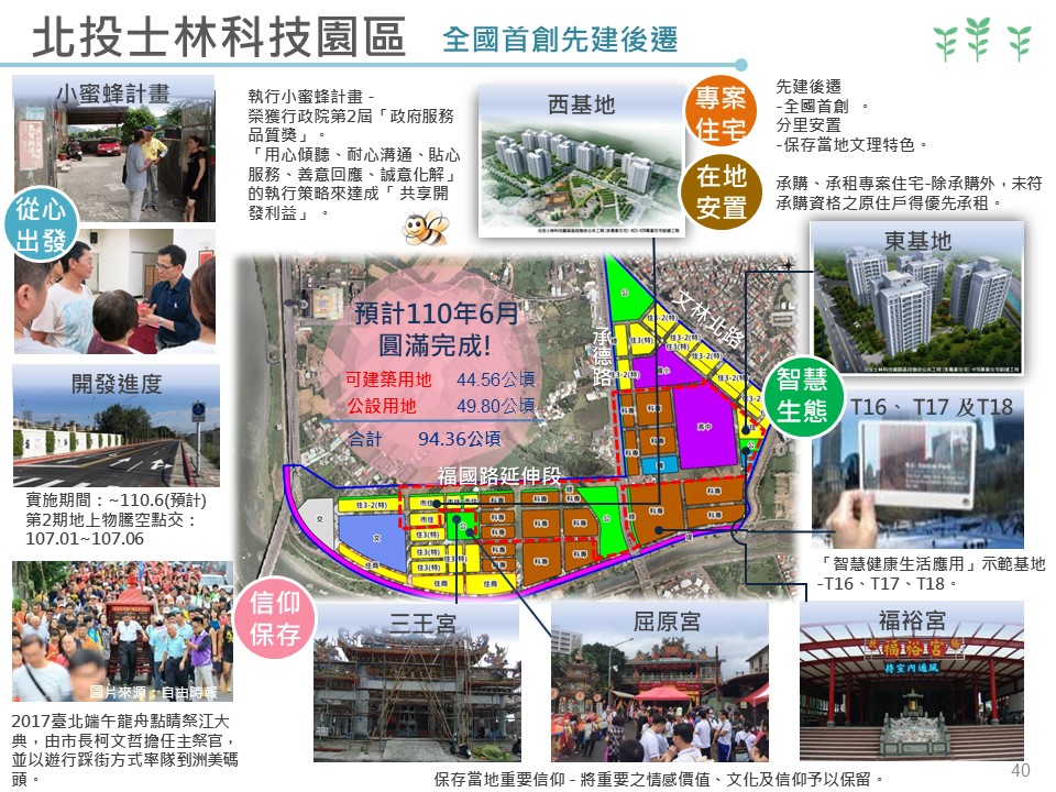 北投士林科技園區區段徵收案,係為串連內湖科技園區及南港軟體工業園區等產業軸帶,打造本市高科技產業創新走廊,除區內引進智慧生態的作法外,辦理過程中採先建後遷,降低開發對拆遷戶的衝擊。整體開發要能順利完成,溝通協調是個關鍵,北投士林科技園區案就是當中的典範,地政局土地開發總隊訂立「小蜜蜂計畫」,以「敲開民眾的大門來直通民眾的心門」的精神,不停與民眾溝通,減少開發過程的不實訊息、提高民眾與政府間的互信,讓整個開發案順利推展,小蜜蜂計畫更榮獲政府服務品質獎的肯定。