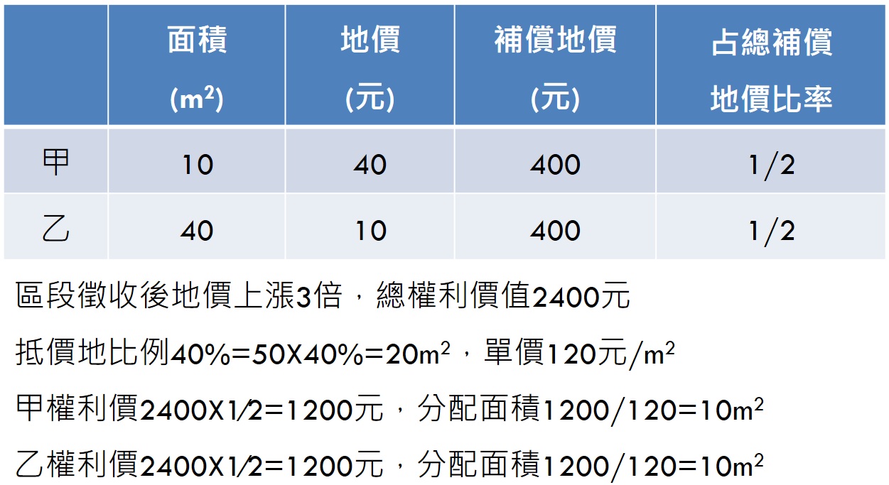 民眾可領回的區段徵收抵價地面積依權利價值的比值來計算,而非僅依土地面積大小而論,故同一區段徵收區內,若地價差異過大,可能造成領回抵價地面積的不公,甚至配回部分超過原有面積的情形。如表一所示,甲持有之土地面積僅乙的4分之1,但因地價差距懸殊,致權利價值計算後,可領回抵價地面積與乙相同,如甲持有土地之原地價更高,則甲可領回之抵價地甚至會比原有面積更多,故勘選區段徵收範圍時,應留意區內地價差異,勿將差距懸殊者規劃成同一案,以免造成以小搏大的不公問題。