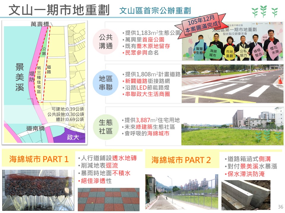 近期臺北市辦竣的整體開發案有文山一期及南港三期市地重劃案,現正辦理中的有北投士林科技園區區段徵收案。其中文山一期市地重劃工程在開發思考上將原有樹木保存公園用地內,並配合景美溪堤岸既有櫻花林木種植櫻花樹,而且為了維護生態永續,使用透水鋪面與透水性側溝,打造前瞻、愉悅、宜居、兼顧樹木保護及生態景觀之智慧永續社區(如圖3)。