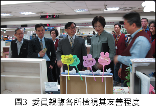 古亭所獲派為活動召集所後,立即邀集各所成立工作小組及LINE組群,密集開會協調,訂頒本局選拔熊讚地所活動計畫,從服務、人氣、友善、宣導及業績等五大面向來選拔,服務面向--以本局第一季考核各地所為民服務項目成績為指標;人氣面向--以網路票選熊讚地所為指標;友善面向--以辦公環境友善程度為指標並組成評分小組邀請外部委員現場評分(如圖2);宣導面向--以臺北地政FB粉絲團宣導按讚數為指標;業績面向--以重點為民服務項目成績合計,並計算總成績最優者為「熊蓋讚地所」。