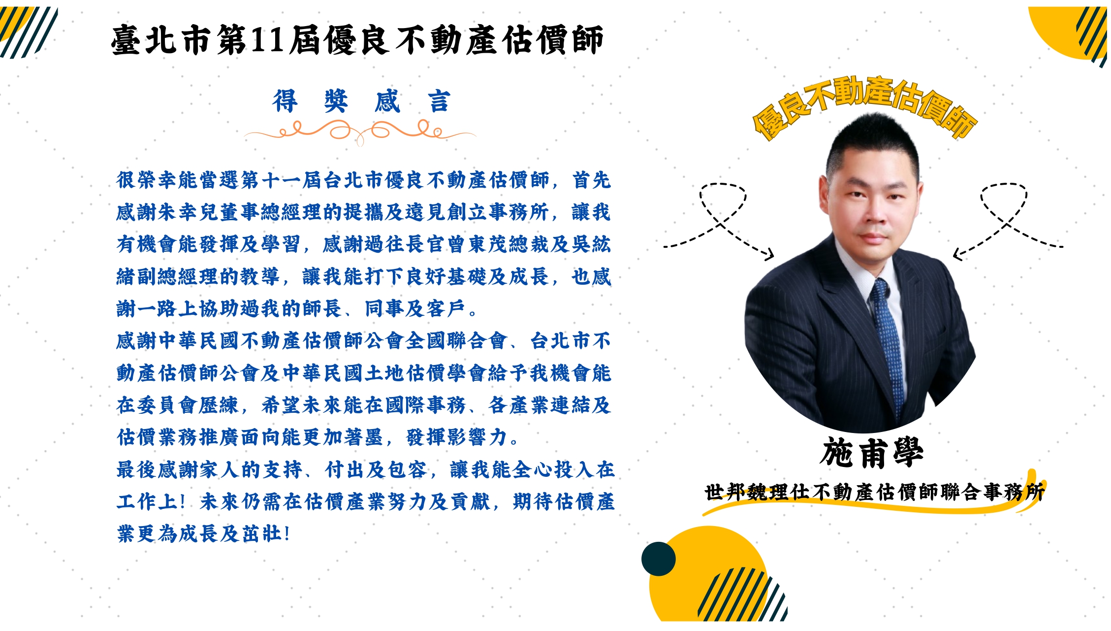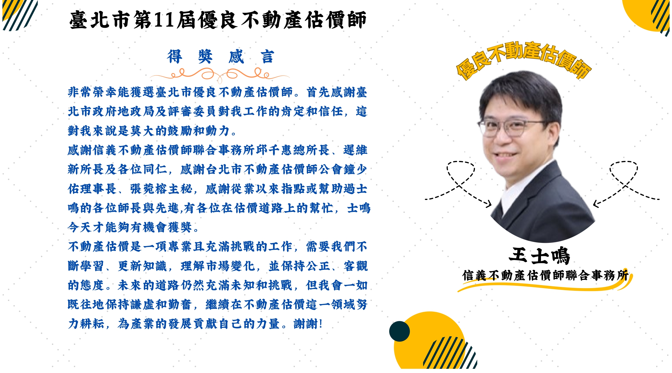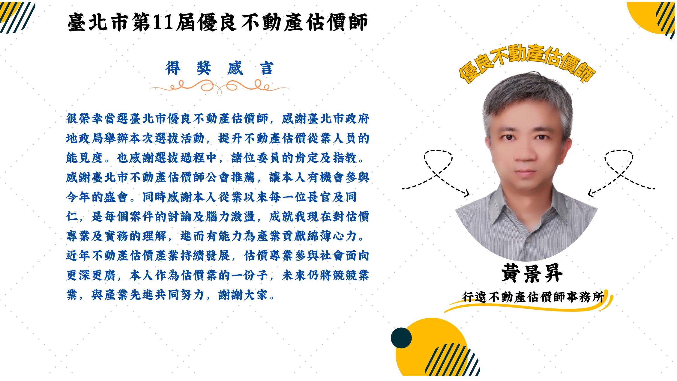 「第11屆優良不動產估價師評選」由社團法人台北市不動產估價師公會、國立臺北大學及中國文化大學推薦6⼈參選,經聘請不動產估價領域之專家學者及機關代表於113年8⽉29⽇進行複評,6位參選人均極為優秀;評選結果由黃景昇(行遠不動產估價師事務所)、王士鳴(信義不動產估價師聯合事務所)及施甫學(世邦魏理仕不動產估價師聯合事務所)獲選為臺北市第11屆優良不動產估價師。