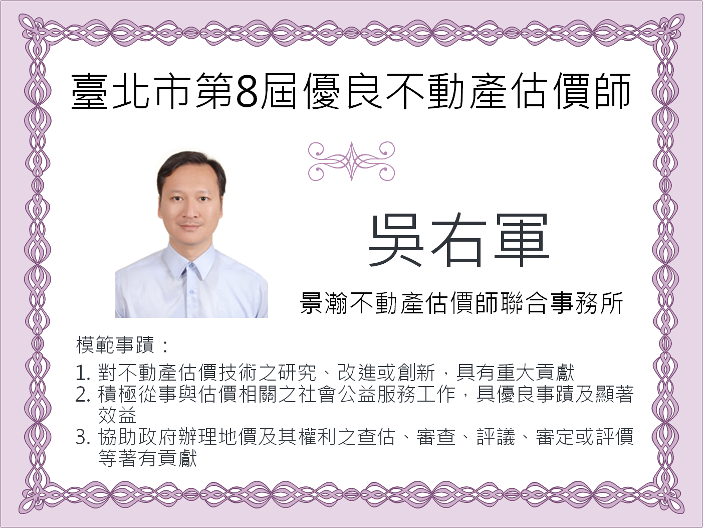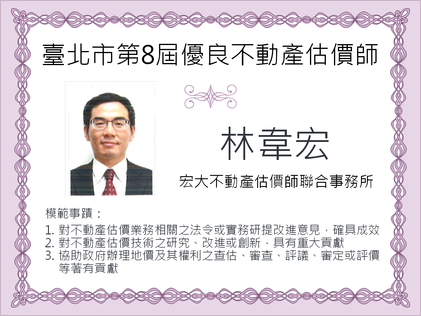 為提升不動產估價師專業能力與服務品質,樹立優良楷模,北市府地政局創全國之先舉辦優良不動產估價師評選活動,自97年至105年已選出13位,此次睽違2年後再度啟動選拔事宜,廣受各界囑目,由於參選人條件皆相當優秀,經聘請不動產估價領域之專家學者及機關代表進行複評,競爭激烈的評選結果名單終於出爐了,共有2位獲選為本市第8屆優良不動產估價師,並將於本府107年11月6日上午10時30分於本府1樓大廳舉辦之地政週活動開幕式邀請市長頒獎表揚,想一睹當選人風采嗎?歡迎到場觀禮!