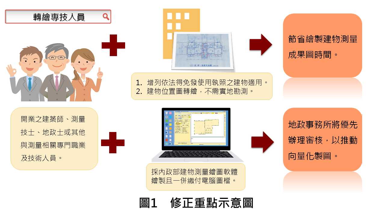 本次修正主要針對專技人員(係指開業之建築師、測量技士、地政士或其他與測量相關專門職業及技術人員)辦理建物轉繪,採用內政部開發建物測量繪圖軟體繪製且一併繳付電腦圖檔者,本市地政事務所將優先辦理審核,減少辦理建物第一次測量審核時間,推動建物圖資向量化製圖,以利未來圖資加值應用。另為辦理簡化建物第一次測量作業,增列依法得免發使用執照建物之適用,且配合內政部推動依地籍測量實施規則第282條之1、第282條之2及第282條之3規定,修正建物平面圖轉繪與不得轉繪相關規定,其中建物位置圖可採竣工平面圖之地籍配置圖轉繪,不需實地勘測,節省繪製建物測量成果圖時間。有關本法修正重點及修正重點示意圖詳如下表1、圖1。詳細內容請至臺北市法規查詢系統查詢。