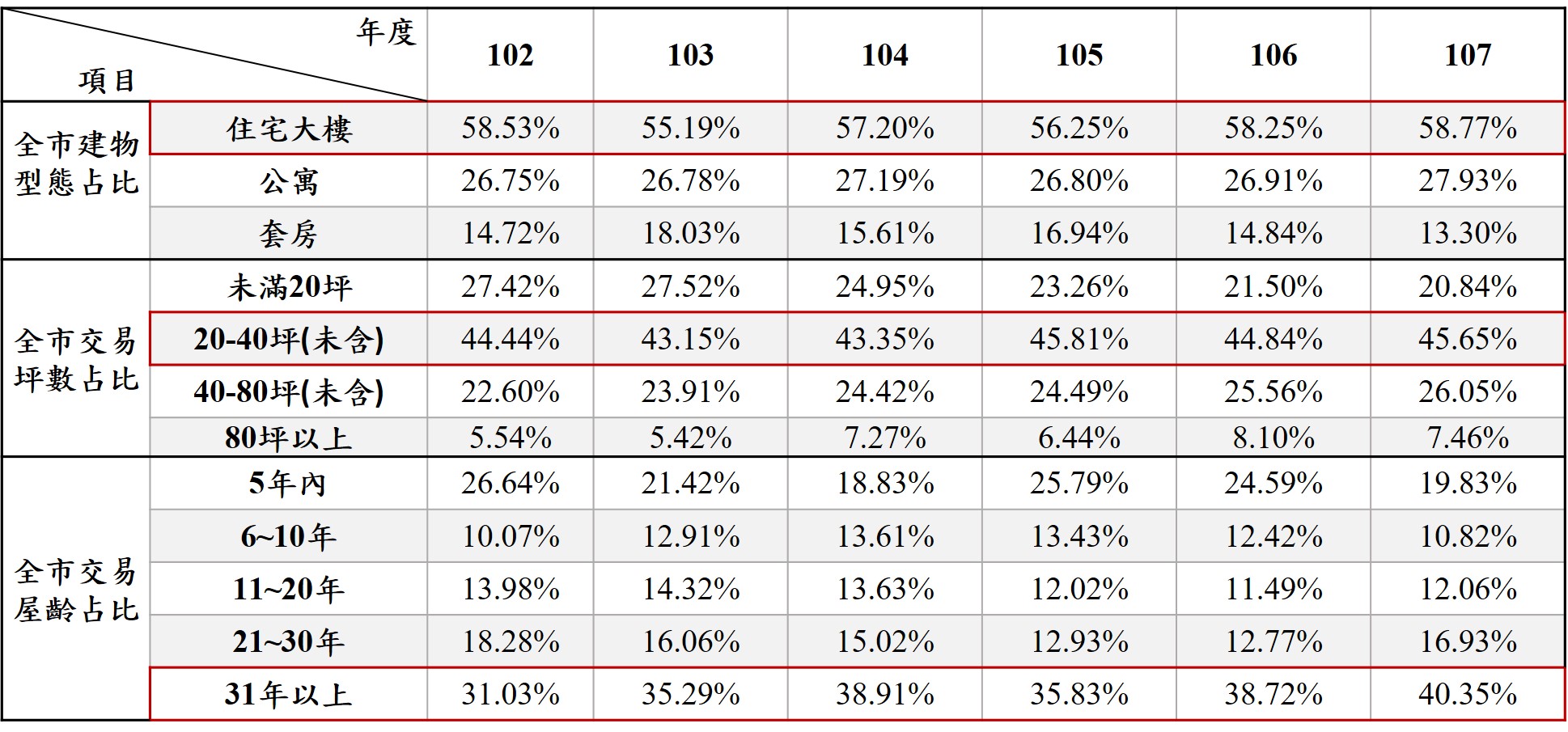 從全市住宅建物型態觀察,107年大樓仍為購屋者最愛,占比58.77%最高。交易坪數部分,以20-40坪為主流,占比45.65%。屋齡部分,以31年以上為交易主力,占比40.35%。