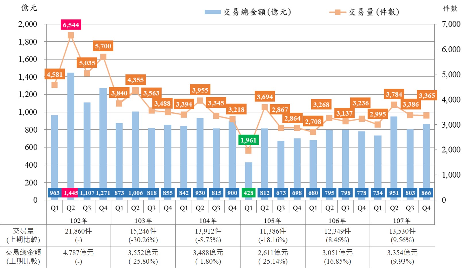 圖1 102至107年住宅交易量及總金額圖