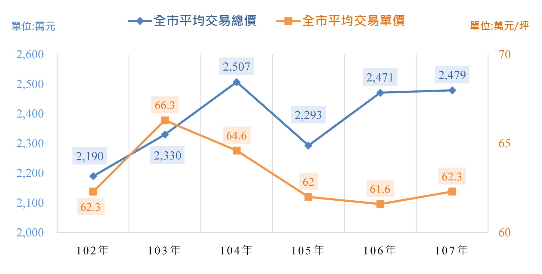 圖2 102至107年全市平均交易總價及交易單價圖