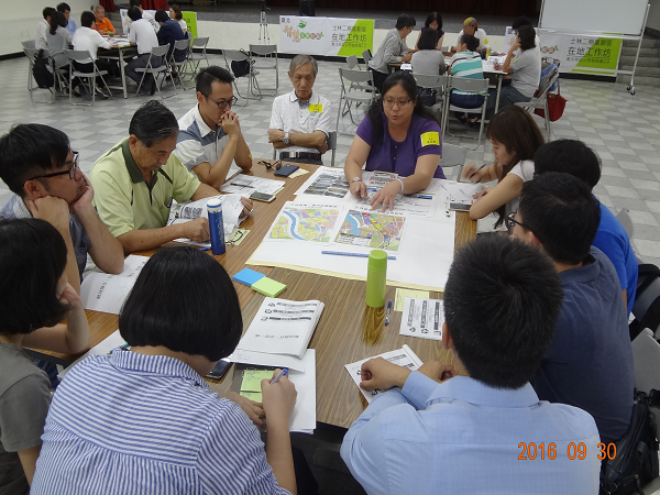 9月30日首先登場的是士林二期重劃區在地工作坊,士林二期重劃區即昔日的基隆河廢河道,廢河道川流意象如同現今本區的發展,像是集合觀光美食、人潮、景點與人文的時空沙河。參與者認為應該讓後代子孫及外來的觀光客知道廢河道歷史,因此結合智慧生態社區理念提出許多具體的建議,如捷運劍潭站外增設電子看板結合導覽團體推播交通、觀光、生態及文史地景資訊;未來開闢濕地公園的保育及水陸連結;科教館周邊道路縫合,強化步行空間;基河路及士商路種植臺灣原生種植物─穗花棋盤腳,營造廢河道意象,及結合中繼觀光景點規劃遊園專車等。工作坊前的桌長會議