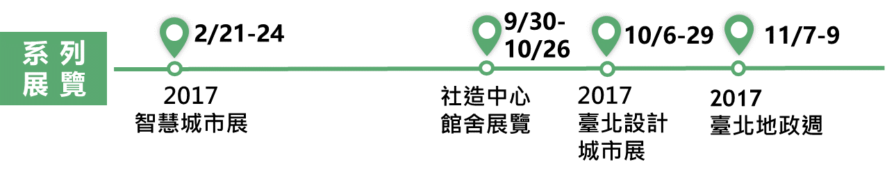 為進一步推廣臺北智慧生態社區理念,並擴大與各界交流共議,地政局106年特別推出了一系列的成果展覽(圖6)。首先在2月份參與「2017智慧城市展」的展出,接著從9月份開始,結合第一屆設計競圖成果,在臺北市社區營造中心展出推動成果,並參與「2017臺北設計城市展」及「2017臺北地政週」的展出。