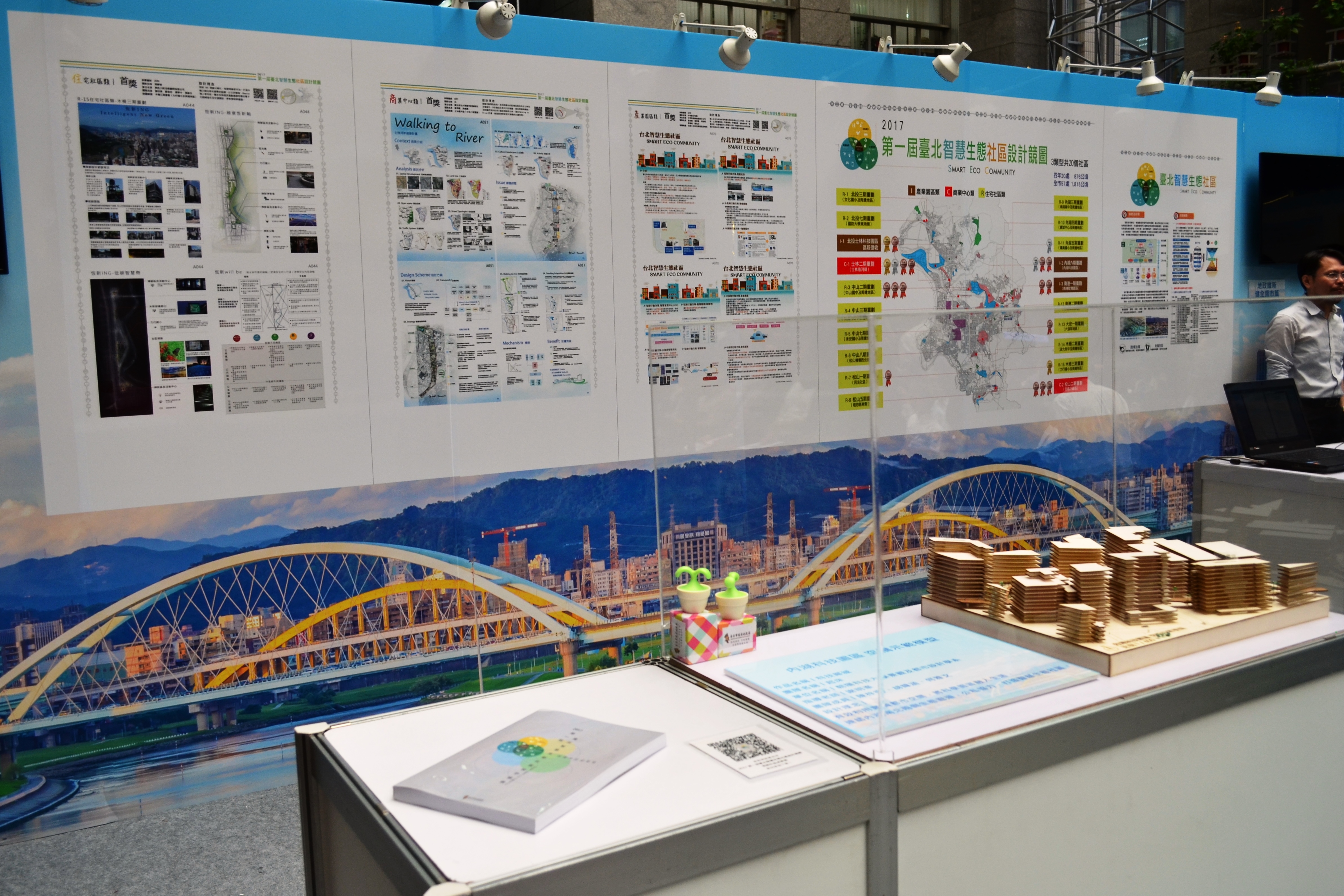 同時,地政局與文化局、資訊局等單位合作,擴大辦理10餘場在地工作坊,更領先全國首辦「2017第一屆臺北智慧生態社區設計競圖」活動,徵求各界就臺北市產業園區、商業中心及住宅社區等3類共20處整體開發地區,提出融合智慧運用、生態環境、人文藝術及社區需求的設計,來共同解決當地問題及提升生活品質。經依3類競圖類型評選出共21件得獎作品,市府於9月19日舉行頒獎典禮(圖1),由市長柯P親自頒獎表揚21組得獎團隊(圖2),期許未來的社區發展能夠朝向「自己的社區自己規劃」邁進,並同步於市府1樓中庭展開為期2日的設計成果展(圖3)。