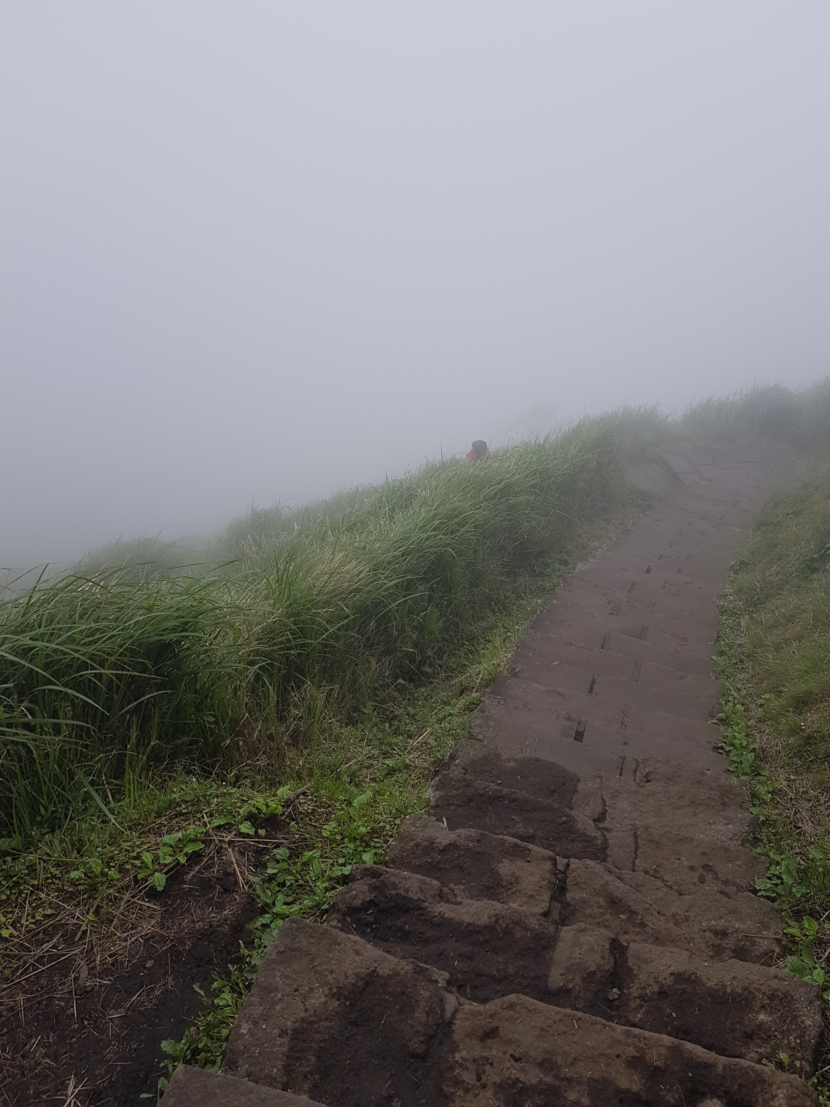 沿著步道一路陡上,途中霧靄氤氳,左右的景色隨著霧氣、雲層瞬間出現又消失,觸目所及大都是雲氣冉冉,若不是經過綿長的陡坡、石階,與不時直衝腦門的硫磺味,真讓人以為身處夢幻仙境。