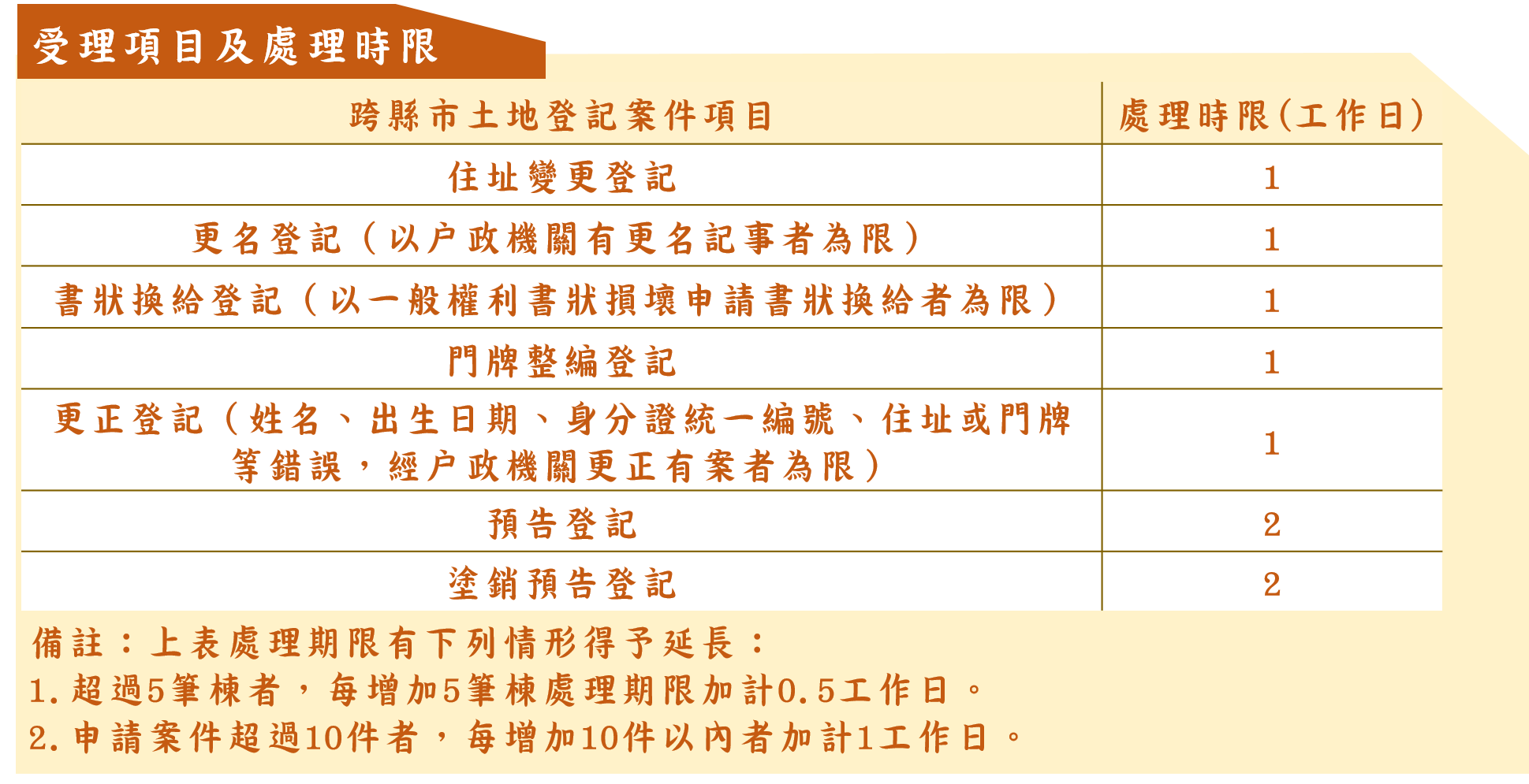 自108年10月1日起至109年6月30日,本市各地政事務所配合內政部試辦跨直轄市、縣(市)收辦土地登記案件,全國22縣(市)之不動產簡易登記案件(登記案件項目及處理時限如圖1),您只要就近到本市任一地政事務所臨櫃申辦,均可為您辦理完成。