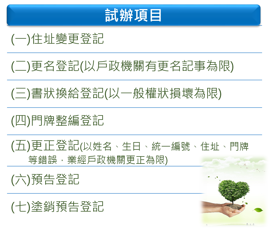 這次試辦跨直轄市收辦登記案件項目,包括經戶政機關更正有案之姓名、出生日期、身分證統一編號、住址或門牌錯誤的更正登記、住址變更、更名、門牌整編、書狀換給、預告登記及塗銷預告登記等7項簡易案件登記。(哪7項?請看下方)