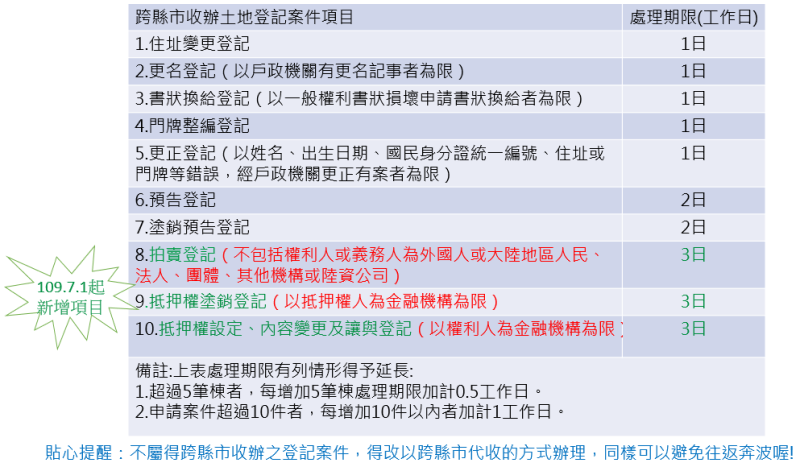 自109年7月1日起,本市各地政事務所配合內政部辦理跨直轄市、縣(市)收辦土地登記案件,除原有的7項簡易登記案件項目外,又新增試辦拍賣、抵押權塗銷登記和抵押權設定、內容變更及讓與登記等3種案件類別(受理項目及處理時限如圖1),您只要就近到本市任一地政事務所臨櫃申辦,均可為您辦理完成。