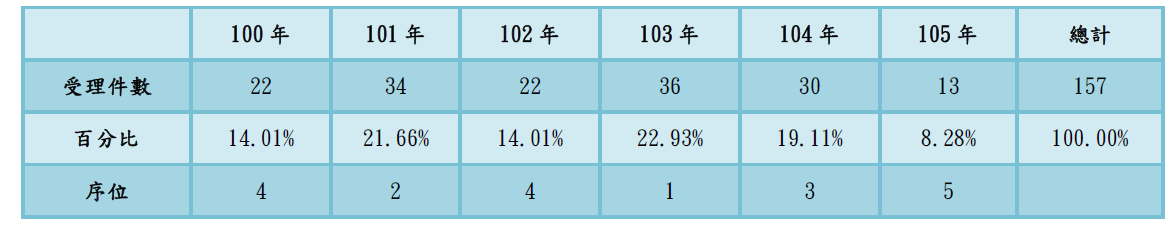 總受理件數為157案,平均每年受理件數為26案,依辦理件數排序分別為:1.103年度(共36案,佔總件數22.93%),2.101年度(共34案,佔總件數21.66%),3.104年度(共30案,佔總件數19.11%),4.100年度及102年度(各22案,各佔總件數14.01%),5. 105年度(共13案,佔總件數8.28%)。其中101年、103年及104年受理件數均大於平均值(26案),又以103年度受理件數最多,105年受理件數最少,僅為平均值50%。103年案件較多,恐因多數案件涉及土地徵收工程,因涉及多數民眾重大權益,故易遭民眾陳情或檢舉,致案件量增加。105年度因為民眾檢舉驟降,為案件量減少主因。