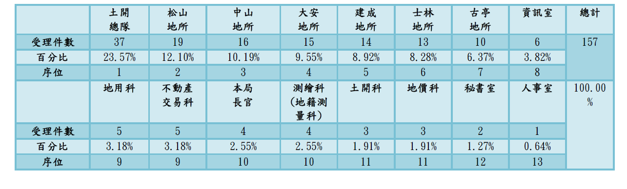 總受理件數為157案,以涉及科室所隊件數排序分別為:1.土開總隊(共37案,佔總件數23.57%),2.松山地所(共19案,佔總件數12.10%),3.中山地所(共16案,佔總件數10.19%),4.大安地所(共15案,佔總件數9.55%),5.建成地所(共14案,佔總件數8.92%),6.士林地所(共13案,佔總件數8.28%),7.古亭地所(共10案,佔總件數6.37%),8. 本局資訊室 (共6案,佔總件數3.82%),9.本局地用科及不動產交易科 (各5案,各佔總件數3.18%),10. 本局長官及測繪科(地籍測量科) (各4案,各佔總件數2.55%),11.本局土地開發科及地價科 (各3案,各佔總件數1.91%),12.本局秘書室(共2案,各佔總件數1.27%),13.本局人事室(共1案,各佔總件數0.64%)。由上可知,件數高之單位,多為本局二級單位,代表被檢舉單位多屬與民眾接觸頻繁之單位。