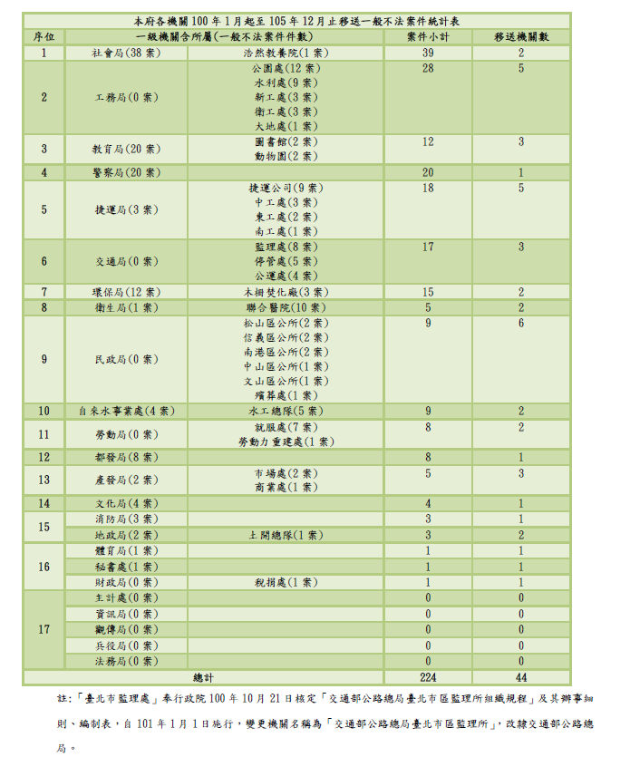 統計本府各一級(含二級)機構於100年1月起至105年12月止,移送一般不法案件共有44個機關,合計224案,其中本局含所屬土開總隊確定成案者為3案,佔本府總件數1.34%,比例偏低;且本局含所屬土開總隊移送時間分別為100年1案、101年2案,均屬早年度之情形,代表近期3年均未有函送案件,機關貪瀆風險狀況幾近於0件;此外,在本府各一級(含二級)機構全部排名序列16名中,第1名至第5名列為高度貪瀆風險機關,第6名至第12名列為中度貪瀆風險機關,第13名至第16名列為低度貪瀆風險機關,本局含所屬土開總隊位居第13名,屬於低度貪瀆風險機關,相對而言,也因本局含所屬土開總隊近3年將業務逐漸推向透明化,使機關整體呈現越來越廉潔之趨勢,本局堪為本府高度廉潔機關之一。四、 本局為民服務滿意度提升為政風檢舉案件量減少主因。