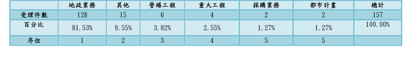總受理件數為157案,以易滋弊端業務型態分析,其中涉及地政業務(共128案,佔總件數81.53%),其次為其他類型(共15案,占總件數9.55%),營繕工程(共6案,占總件數3.82%),重大工程(共4案,占總件數2.55%),其他採購及都市計畫(各2案,各占總件數1.27%)。代表本局受外界矚目仍以地政業務為主,少數為其他、工程、採購等類型。