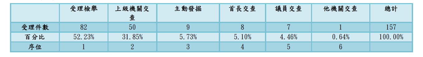 總受理件數為157案,以案件來源分析,其中受理檢舉(共82案,佔總件數52.23%),其次為上級機關交查(共50案,占總件數31.85%),主動發掘(共9案,占總件數5.73%),首長交查(共8案,占總件數5.10%),議員交查(共7案,占總件數4.46%),他機關交查(共1案,占總件數0.64%)。代表本局案件來源,均數受理民眾檢舉案件為主,多因民眾申請案件中對行政處分之疑義或因不諳法規,或因對業務單位回覆仍有疑義或不滿,致誤解而陳情或檢舉。