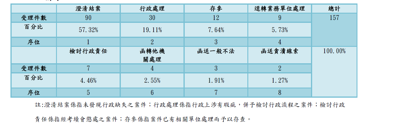 總受理件數為157案,以查處結果分為8類:(1)澄清結案:所謂澄清結案是指,未發現行政缺失,屬於民眾誤解法令,而予以澄清,並簽陳結案,此類計90案,佔總件數57.32%。(2)行政處理:所謂行政處理是指,查有行政上之疏漏或缺失,並提出興革建議,移請權責單位處理,即時導正缺失,此類計30案,佔總件數19.11%。(3)存參:所謂存參是指,查無具體不法事證,且無涉行政違失,經陳報政風處核准後,註記存參,此類計12案,佔總件數7.64%。(4)逕轉業務單位處理:所謂逕轉業務單位處理是指,非屬檢舉不法案件,視案件及業務性質移送主辦單位處理,此類計9案,佔總件數5.73%。(5)檢討行政責任:所謂檢討行政責任是指,未構成貪瀆犯罪而涉有行政疏失或違反法規者,依本府行政肅貪執行要點相關規定,簽報機關首長議處,確實追究相關人員之懲戒或懲處責任,此類計7案,佔總件數4.46%。(6)函轉他機關處理:所謂函轉他機關處理是指,非屬本局主管業務者,並回復陳情人將移送其他權責機關處理,此類計4案,佔總件數2.55%。(7)函送一般不法:所謂函送一般不法是指,查察後發現未涉有貪瀆之一般刑事不法案件者,即函送司法機關偵辦,現此類計3案,佔總件數1.91%。 (8)函送貪瀆線索:所謂函送貪瀆線索是指,發現涉有貪瀆不法情事,陳報政風處審查,由政風處函送廉政署立案調查,前期掌握弊端,此類計2案,佔總件數1.27%。