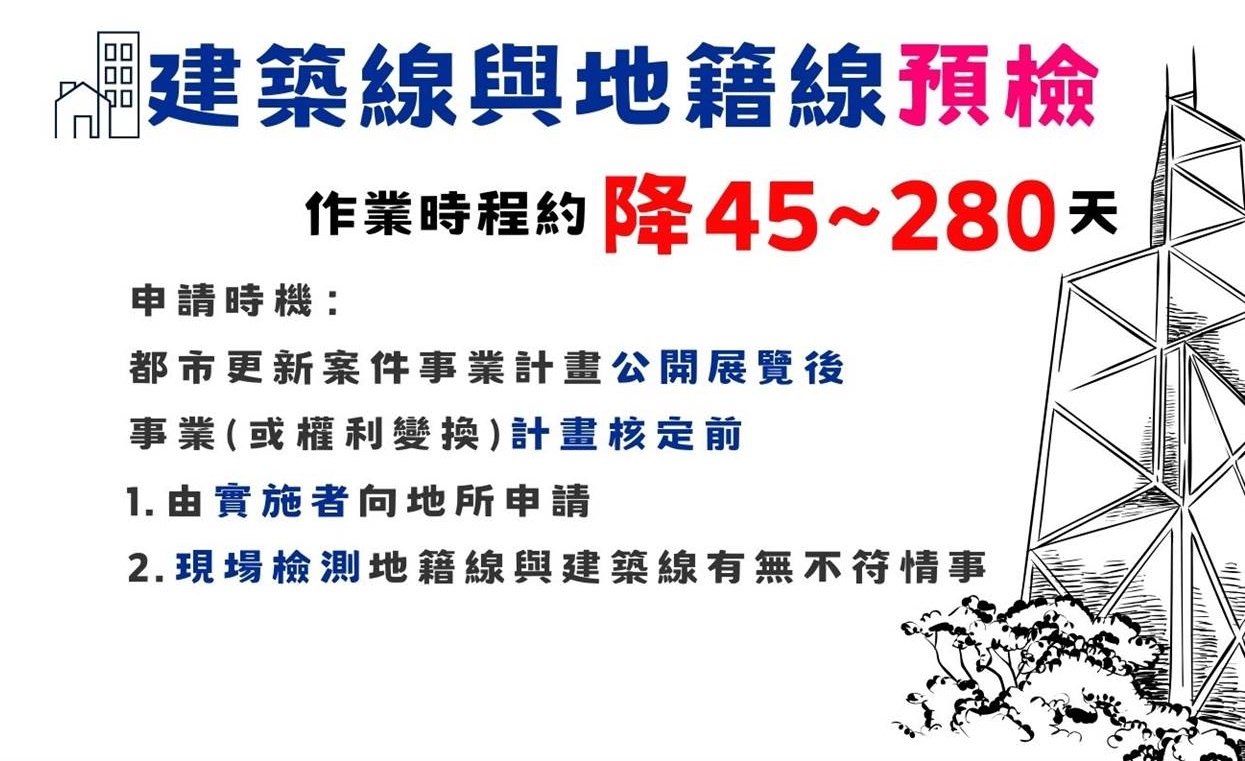 為及早發現本市都市更新案件是否有地籍線與建築線不一致以早期處理,臺北市政府地政局提供「土地建築線與地籍線預檢」服務。