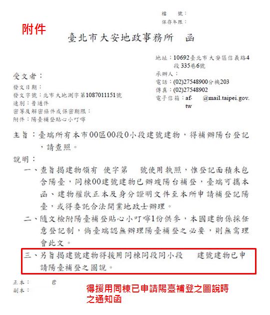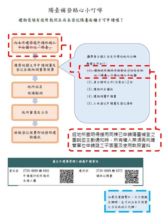 臺北市在民國62年才規定陽臺得以附屬建物辦理登記,所以民國62年以前登記的建物,大部分不含陽臺, 62年以後使用執照竣工圖大多也未註記陽臺,故現在仍有部分建物登記面積未包含陽臺。以往陽臺補登業務地所是被動受理,由建物所有權人自行申請,自民國107年起,北市地所如有受理陽臺補登之測量案件,於案件辦竣後會主動發文通知同棟其他樓層尚未補登陽臺之所有權人,是一項保障建物所有權人的貼心服務。同棟其他樓層得援用不同樓層已完成陽臺補登圖說