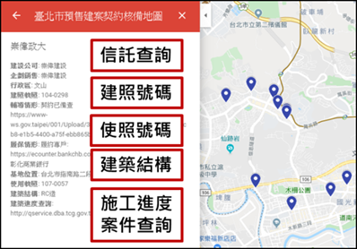 資訊透明為健全房市的重要關鍵,為全面完整提供預售建案資訊,地政局自107年3月在地政局官網的「不動產交易」專區建置「預售建案契約核備地圖」,讓民眾透過可視化地圖呈現方式立即得知預售屋契約備查相關資訊,並持續精進及擴充相關功能。為避免消費者誤將買屋價款逕交建商後被移作他用,發生建案無法續建爭議,前開地圖107年增加了預售建案價金信託履約保證專戶查詢;今(108)年再增加使用執照及建築結構資訊查詢,提供消費者了解建案建築結構評估購買意願。另外,消費者除了關心繳款安全,也關心房子何時可以完工入住,所以前揭地圖將連結本市建管處的建造執照開工申報及使用執照收圖電子化系統,預計11月可上線查詢,民眾未來連同預售建案施工進度都可查。另一方面,臺北地政雲之「預售建案契約管理平台」亦已同步彙整建案相關資訊,除了提供民眾查詢亦提供檢舉功能,民眾還可以掌握該系統預售契約核備情形,歡迎民眾上地政局官網查詢使用,以確保自身權益。