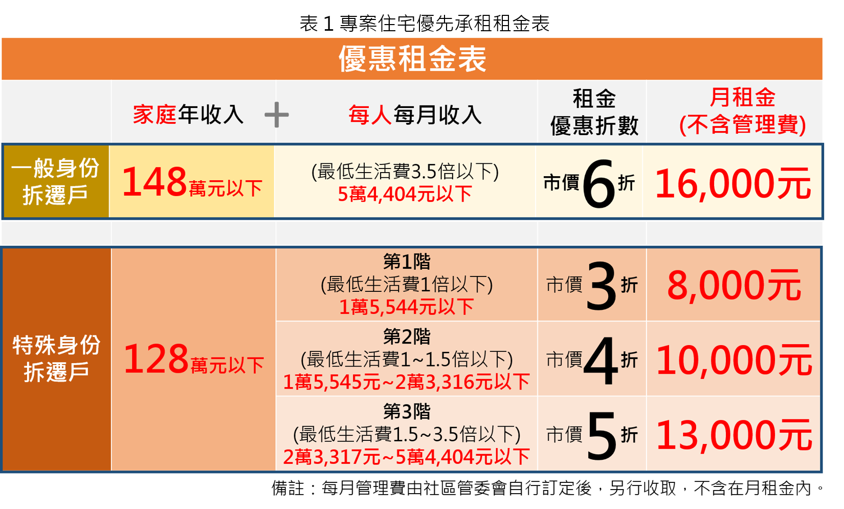 考量北士科地區仍有部分住戶未能符合配售專案住宅資格而未能在地安置,基於擴大照顧在地居民居住需求,本市再創全國之先,將專案住宅配售予承購戶後之剩餘戶數,以優惠租金價格提供未獲配售專案住宅之原住戶優先承租。租金為市價行情6折;如為特殊身分資格之原住戶,可再依家庭年收入所得狀況,以市價行情3折至5折承租。租期以6年為原則;如情形特殊經市府同意展延者,總租期最長可達12年(表1)。開發品質更提升