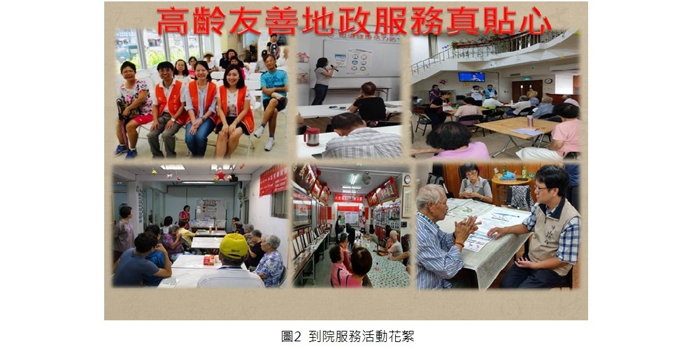 為更積極具體落實「到府到院」服務,臺北市政府地政局所屬所地政事務所自107年8月起,主動與轄區內與老人福利機構攜手合作,深入各行政區內老人服務據點,對年長者宣導與其權益息息相關的措施,並提供地政便民措施與即時法令諮詢服務,為年長者排解疑惑,現場互動熱絡。(圖2)