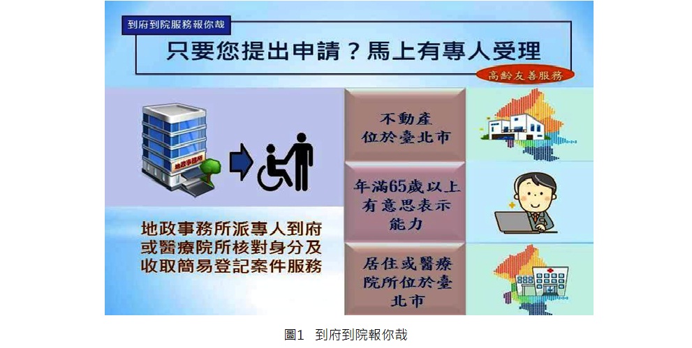 臺北市政府地政局105年4月推出「臺北市高齡社會地政貼心服務計畫」各項地政貼心服務行動以來,截至107年8月31日總服務人次逾44,987人次,多數高齡長輩朋友對各項服務都給予高度支持與肯定。此外,為積極服務高齡長輩朋友們,凡所有不動產標的位於臺北市轄區,年滿65歲以上具有意思表示能力,實際住所或醫療院所位於臺北市者,符合資格者只要提出申請或由相關機關轉介至地政事務所,即派專人到府或到院提供核對身分與收件「到府到院」服務,減輕高齡長輩朋友們出門辦理地政業務的不便與負擔。(圖1)
