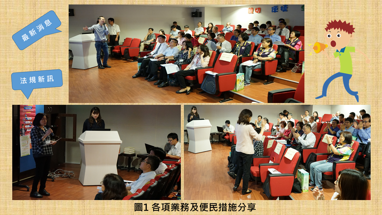 為使座談會內容豐富多元,特別針對與民眾權益息息相關的「地籍異動即時通」、「未辦繼承登記不動產」、「臺北市智慧地所服務」、「行動支付」與「公務機關信用卡繳費平台」等各項最新法規新訊與便民措施進行宣導;除此之外,座談會中也特別邀請國稅局及稅捐稽徵處人員分別就「個人課徵房地合一所得稅制度、遺產稅及贈與稅附件上傳功能上線」及「稅務E化與便民服務措施」加以說明(圖1),宣導內容精采豐富,與會地政士們獲益良多。