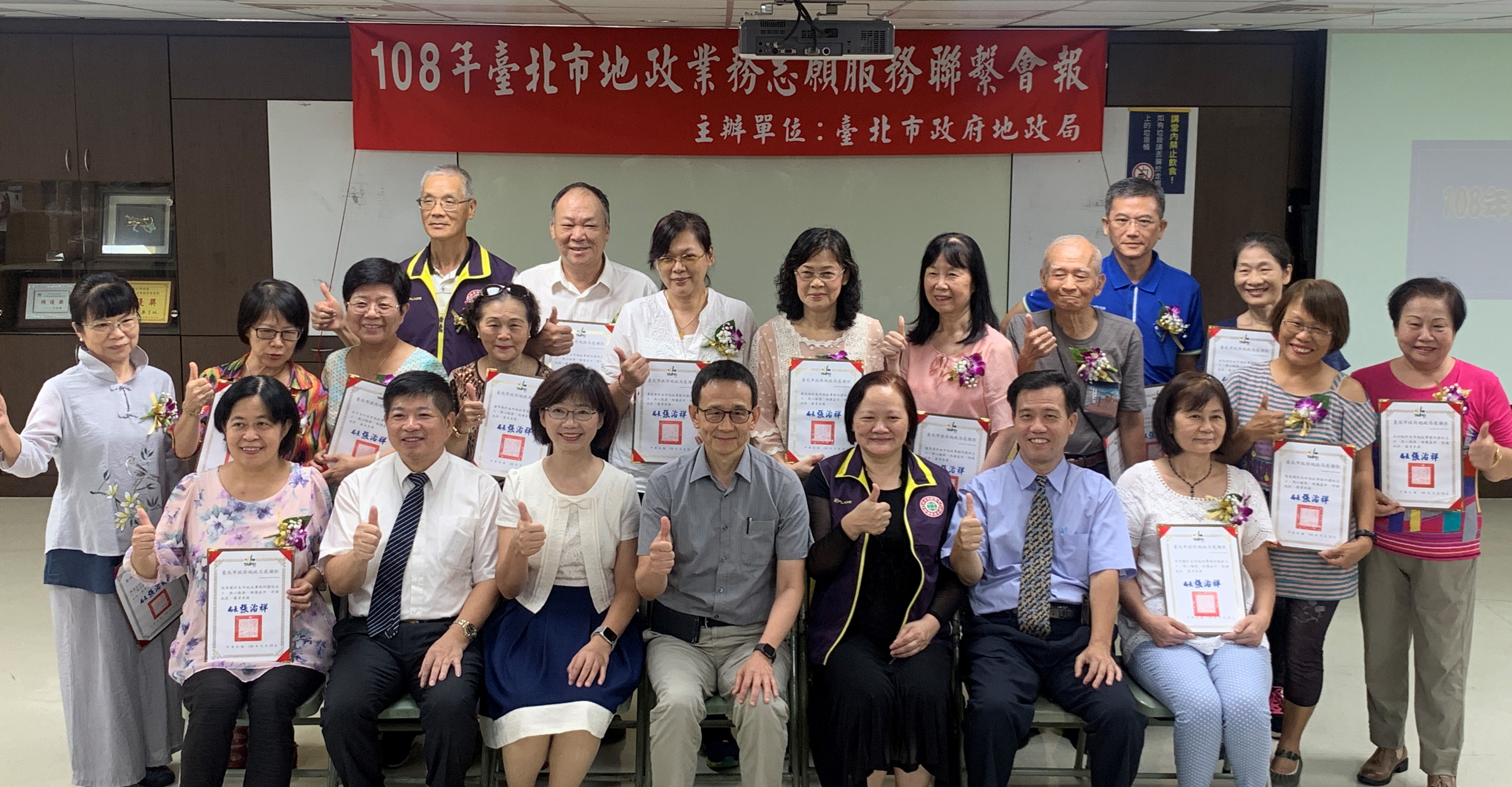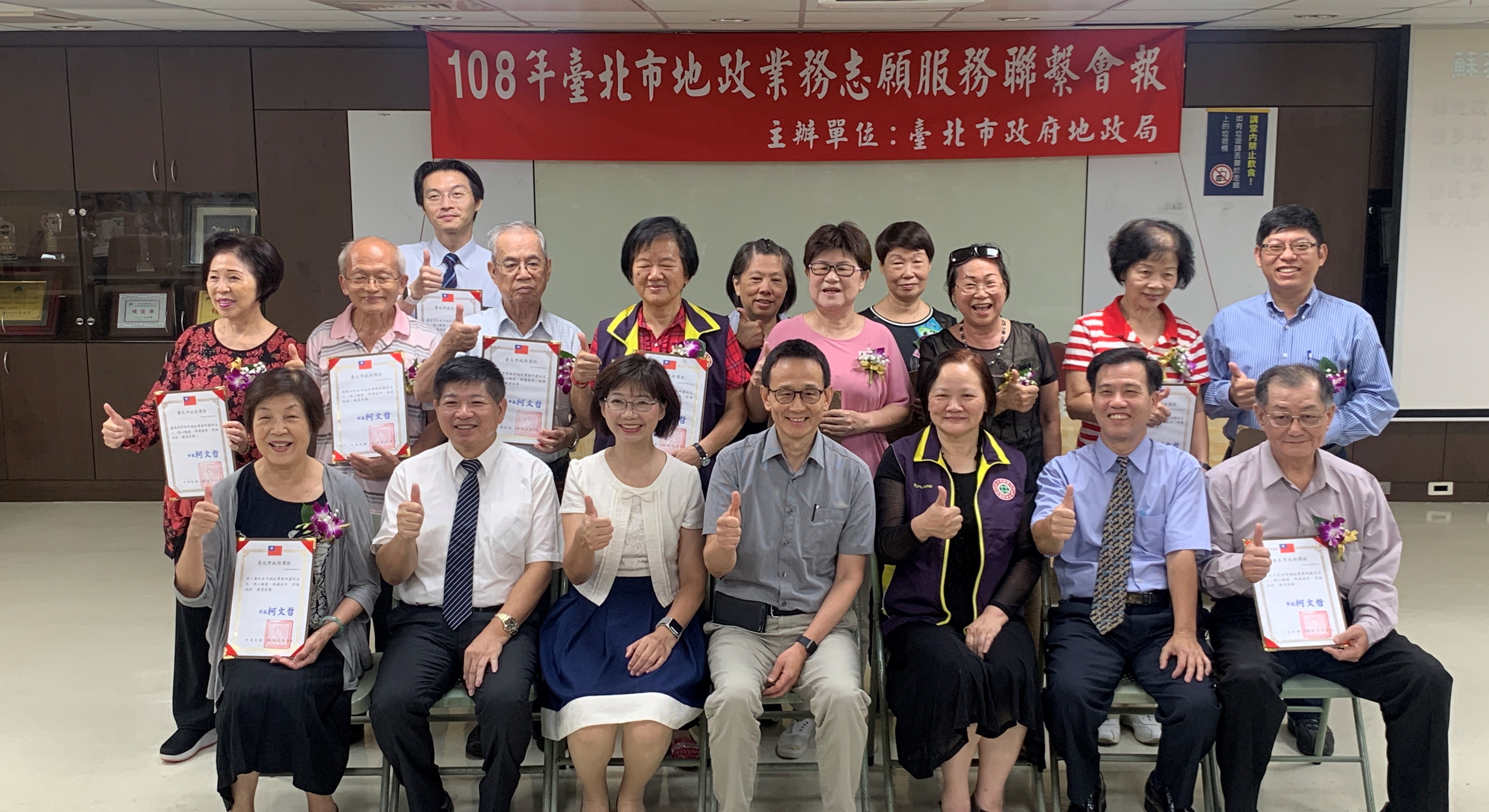 為表揚績優地政志工,增進與志工間溝通與互動,加強運用社會資源,本局於本(108)年8月29日上午召開108年臺北市地政業務志願服務聯繫會報,希望結合社會人力資源,鼓勵民眾參與地政志願服務工作。當日首先由本府李副秘書長得全頒獎表揚績優地政志工市府獎狀21人,並由本局張局長治祥頒獎表揚績優地政志工地政局感謝狀20人及長青志工志願服務松青獎獎狀3人,共計表揚44人。