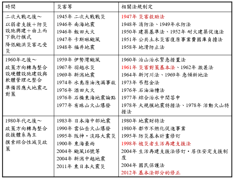 表一 與災害相關之法規••從二次大戰後至東日本大震災