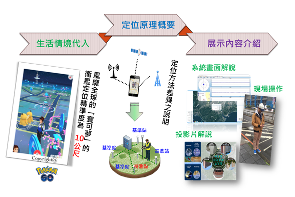 展示臺北市衛星定位基準網之基本資訊、定位原理、應用面向,展示的手段包含「系統畫面解說」、「投影片解說」、「現場操作」(圖二)。