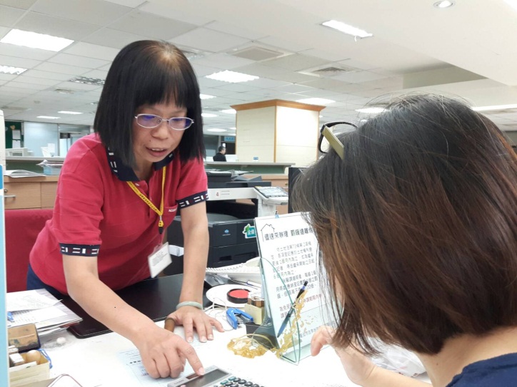 張員係於民國89年進入古亭所服務,曾任登簿、校對、全功能櫃檯、地籍檔案室清查工作等業務,並於105年初派駐於服務臺服務,服務期間與民眾長期接觸,有感於土地登記案件類型繁複致一般民眾洽辦不易,促使著她積極學習相關法令新知,秉持著親切與熱忱的態度,期盼提供洽公民眾熊讚的服務。松山所呂素霞同仁
